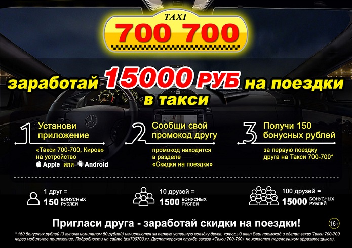 Пригласи друзей и заработай 15 000 бонусных рублей на поездки в Такси 700-700.